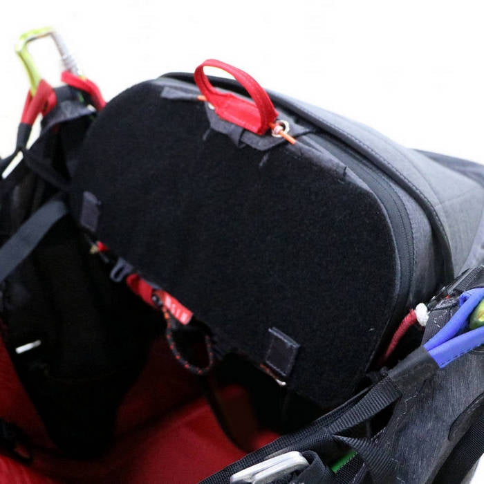 The Genie Lite 3 Rescue Deck sits on the cockpit, attached by hook-and-loop fastener. This means it is also compatible with most other pod (cocoon) harnesses which feature a cockpit with hook-and-loop fastener, which most, if not all, do. The reserve bridles are connected to the harness main carabiners. The secondary reserve can be easily deployed with either hand, in case your primary reserve handle cannot be reached or the reserve becomes caught in the glider.