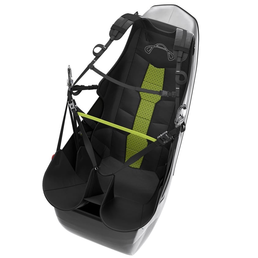 Thanks to modern 3D methods of harness development the no-seatboard PROGRESS 3 fits the pilot’s body perfectly in flight. Enhanced and lengthened Legpads, and individually adjustable lower back support guarantee maximum flying comfort. Legpad effectiveness and sophisticated harness geometry also give the reversible harness precise weightshift response. PROGRESS 3 comfort begins on the ground: the Legpads allow maximum freedom of movement for takeoff and landing.
