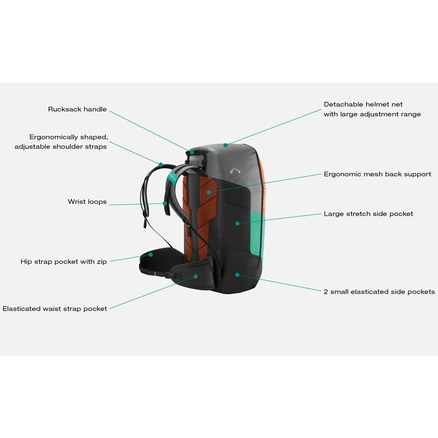 The Air-Foam Hybrid-Protector automatically fills with air when the rucksack is reversed into a harness, and under normal circumstances is ready to function after about 60 seconds. For maintenance it can be taken out of its own compartment under the seat shell. For maximum lifespan the protector should not be left compressed for extended periods, and never stored when wet.