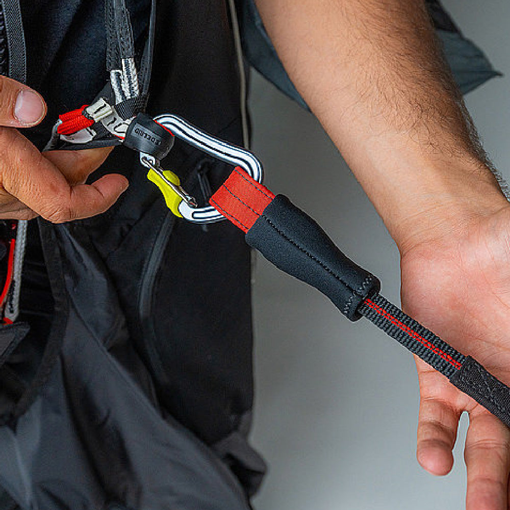Ready for take off. It is important to close the ARTUS correctly so that you can get into the air quickly and safely. The diagram on the leg loops shows you how to correctly connect the coloured straps with the corresponding metal rods and rings. The colour coding for each side corresponds to the familiar scheme found on most NOVA paragliders, which prevents the possibility of incorrect attachment: red for left and green for right. The EASE Aerotec carabiners from Edelrid, specially developed for paragliding, guarantee minimum weight with maximum strength.