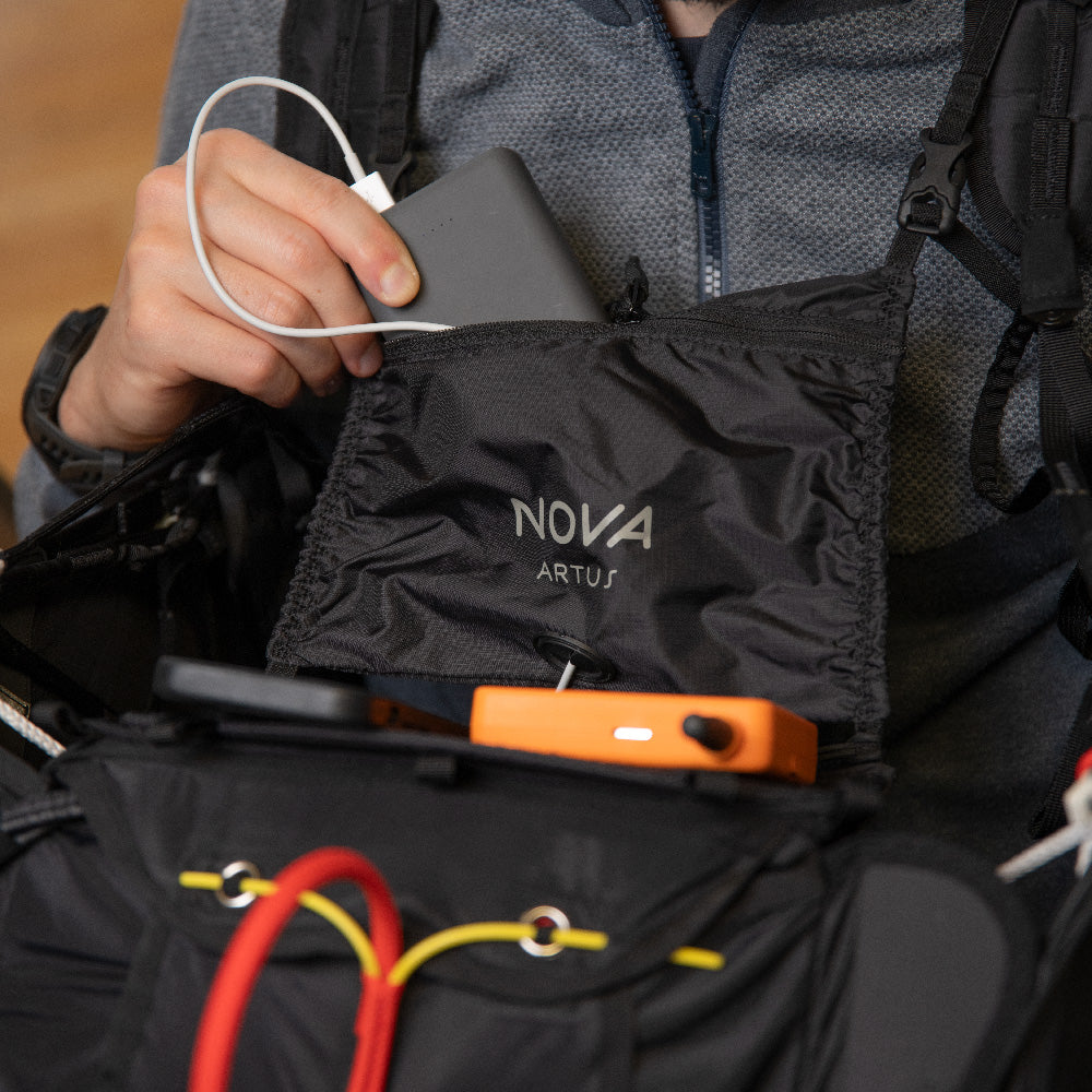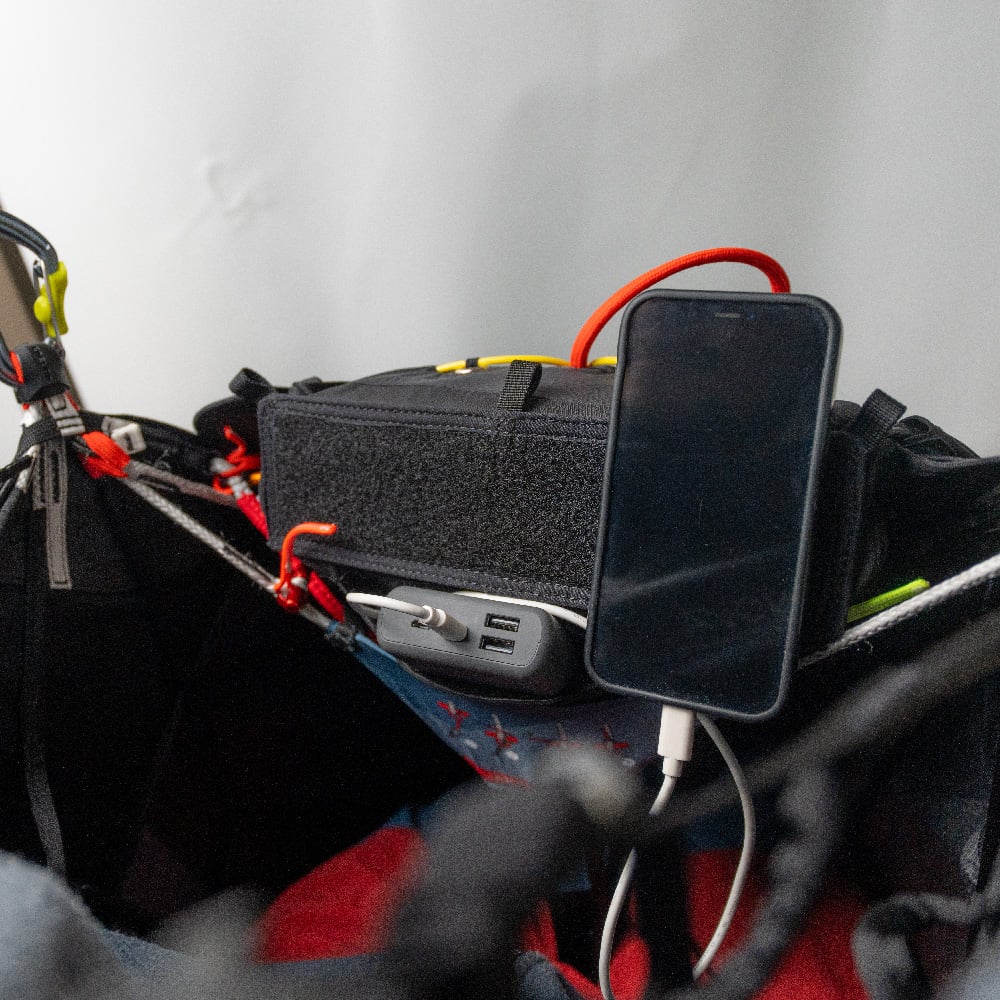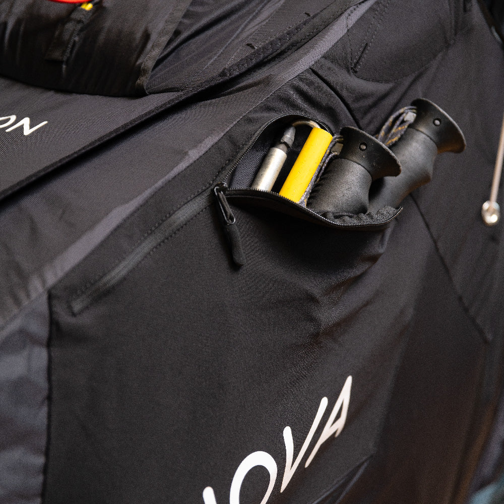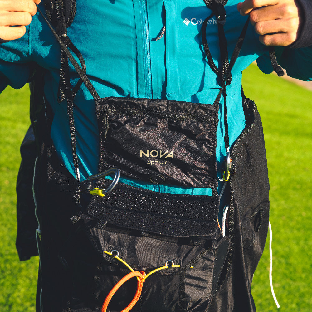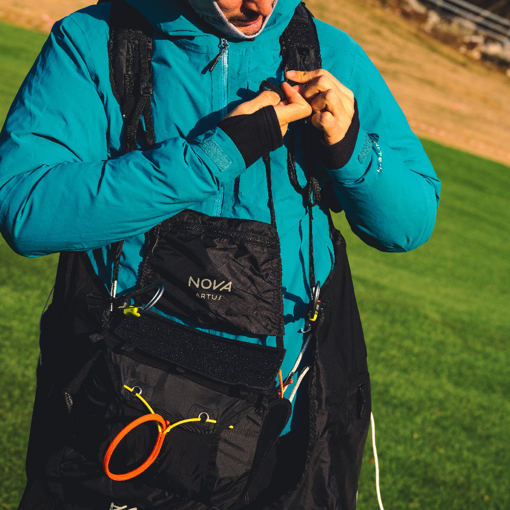 Space for gear. The ARTUS offers plenty of storage space thanks to its various pockets and compartments. The back compartment offers the most space. There is a zip pocket on the left and right side of the pod and there is also space under the seat. The detachable kangaroo pocket at chest height can be used to store small items such as a power bank or muesli bar. There are Velcro straps on the cockpit and shoulder straps to secure instruments. There are also channels for the drinking tube from the back compartment and for the pee tube on the outer shell.