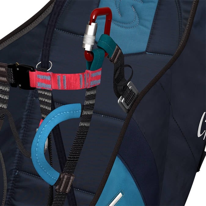 The airbag protection is designed for extensive professional usage: maximum passive safety for the passenger and perfect fit with the pilot harness. User-friendliness and efficiency for the tandem professionals was key in the development of this harness: 2-point locking system, assistance handles, intuitive and accessible settings, smooth transition from standing to sitting and of course one-size!