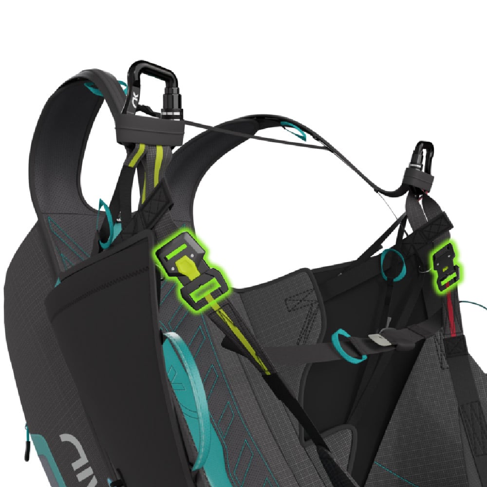 The T-Lock system that secures the pilot in the harness consists of two Edelrid buckles. This system has been specially designed to offer maximum safety and simplicity.