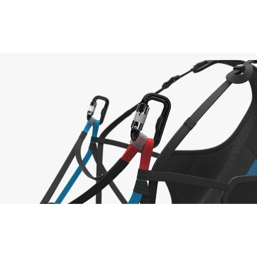 Depending on preference, the carabiners including «Antitwist» can also be mounted on the front strap. For closing the harness clip the carabiners into the red and blue main loops.