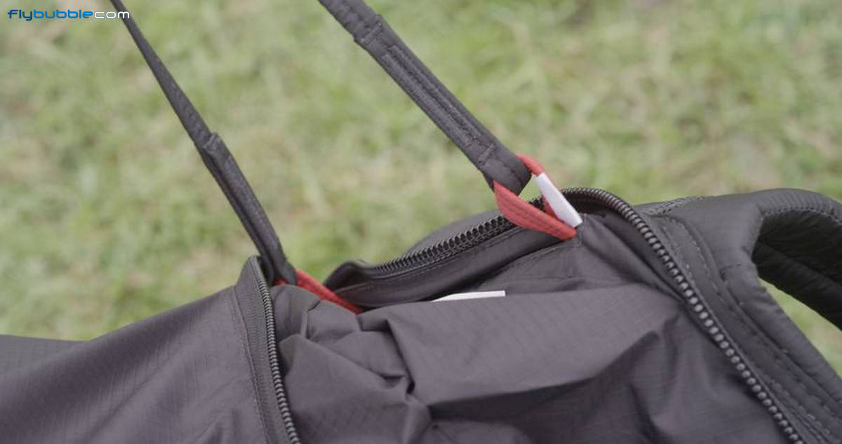 Pack your folded paraglider in the conically shaped COMPRESSBAG. After closing the side zips you can squash the air out of the bag, and reduce the glider volume considerably. This will leave enough room in the rucksack for clothes and instruments. Put the COMPRESSBAG in the top end of the rucksack and pull the rucksack side flaps up around the glider to hold it. The zips will then be easier to close. Then push the COMPRESSBAG down when both side zips are done up and the rucksack is horizontal.