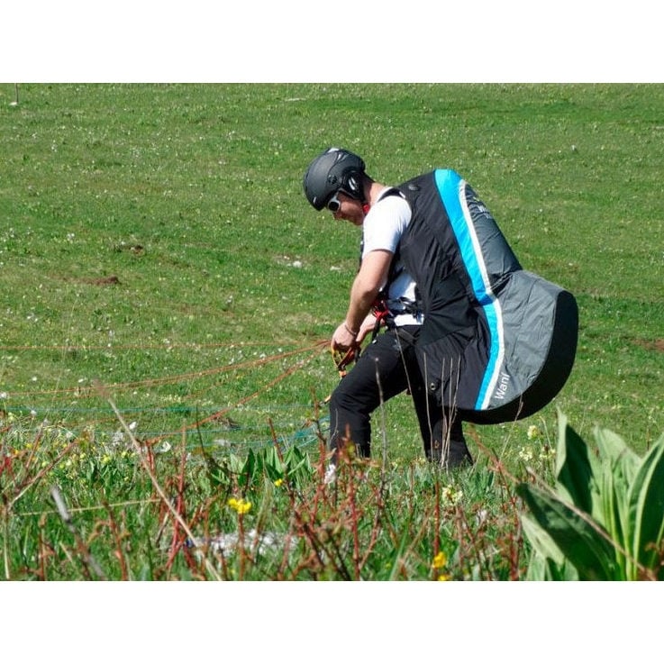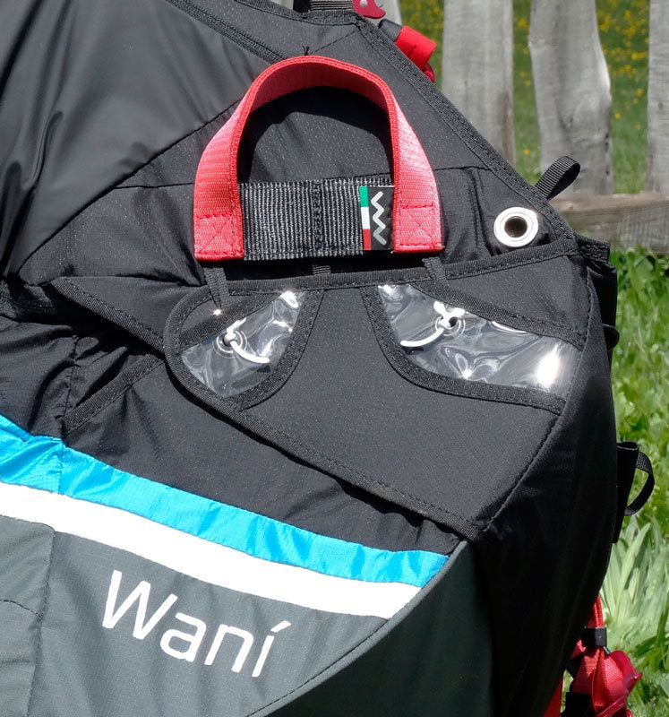 In flight configuration, Wani has a spacious rear pocket, in which a backpack for transport can be stowed. You can place clothing and a camel-bak in the remaining space. Two pockets are provided on the sides of the harness: the left one in elastic mesh contains a practical radio port and the right one in elastic Lycra has a zip closure.