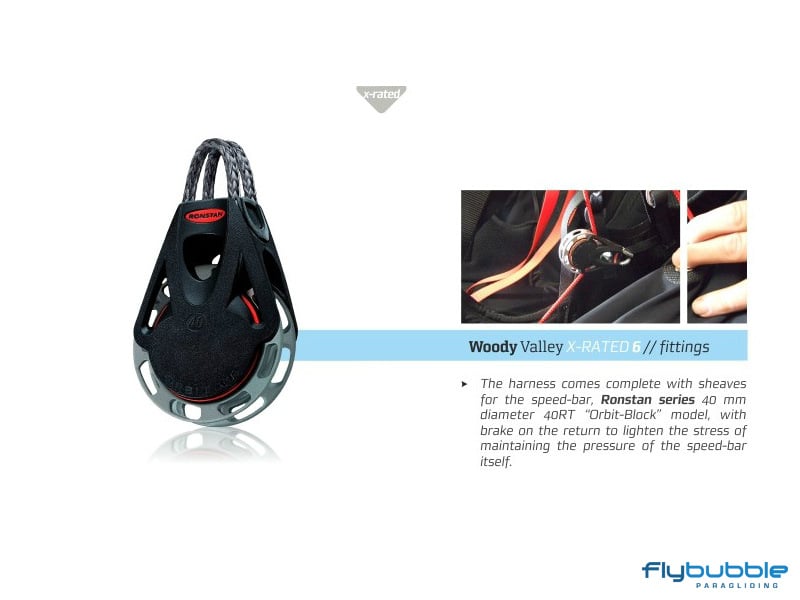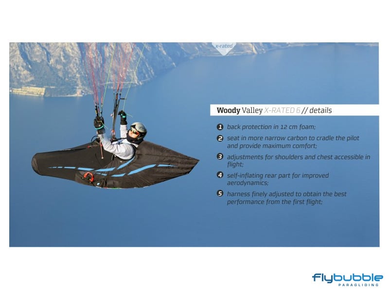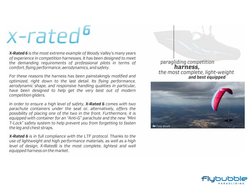 The most extreme example of Woody Valley's many years of experience in competition harnesses, X-Rated 6 has been designed to meet the demanding requirements of professional pilots in terms of comfort, flying performance, aerodynamics, and safety.