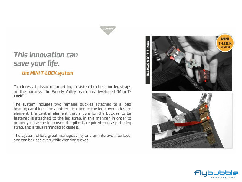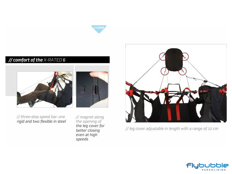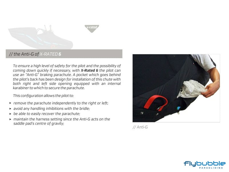 In order to ensure a high level of safety, X-Rated 6 comes with two parachute containers under the seat or, alternatively, offers the possibility of placing one of the two in the front. Furthermore, it is equipped with container for an "Anti-G" parachute and the new "Mini T-Lock" safety system to help prevent you from forgetting to fasten the leg and chest straps.
