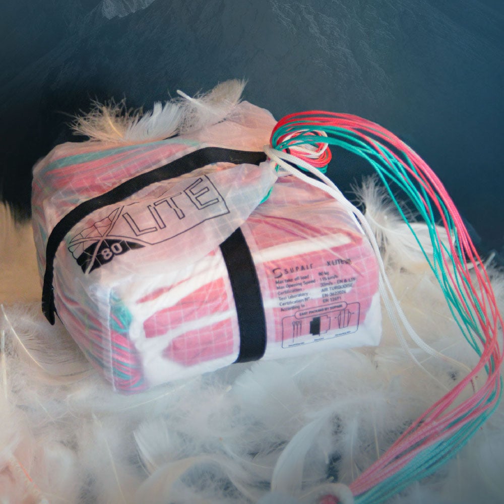 Supair believe that a parachute should be easy to pack, so that the pilot can comply with the recommended packing frequencies and guarantee his safety. Although the X LITE is a lightweight, high-performance High parachute, it's still easy to pack thanks to its multiple visual markings. These markings tell you exactly where to hold the panels to pack this square parachute correctly. Whether it's the color-coded lines to divide the beam, the togglesto bring the panels together, or the markings for a precise Bending , the X LITE simplifies the Bending steps as much as possible.