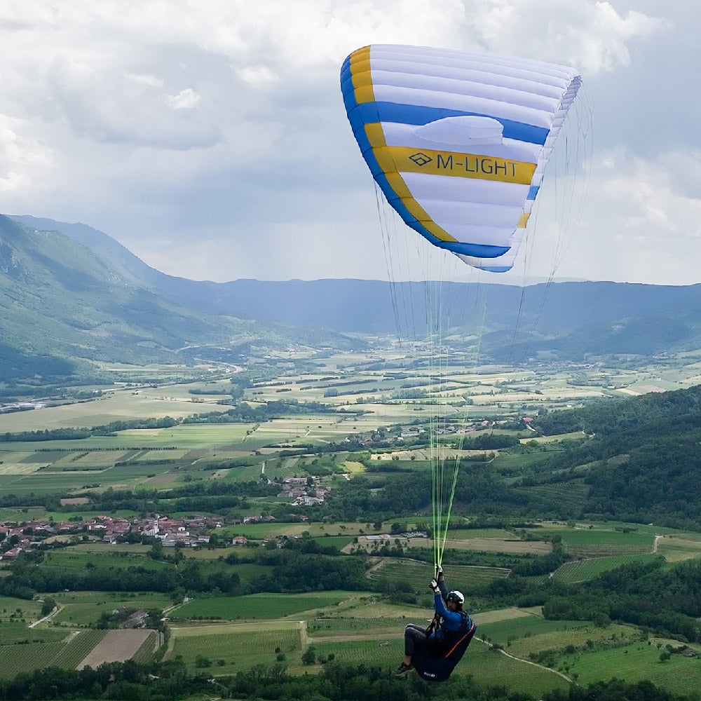 If you’re looking for a new adventure, you’ll love the M-light, the newest wing from Triple Seven that will elevate your hike & fly experience. The M-light is a light and safe wing that gives you the freedom and fun of exploring the sky with ease and confidence. It’s made of high-quality Porcher Skytex 27 fabric, with double coating on the outer canopy and hard finish on the inner structure, ensuring durability and performance. The lightweight riser is carefully designed to help you launch smoothly, even in challenging conditions, saving you time and hassle. The M-light is your ideal companion for your next adventure, whether you’re soaring over mountains, flying across valleys, or landing on remote spots. Don’t miss this opportunity to get your M-light today and start your adventure tomorrow.