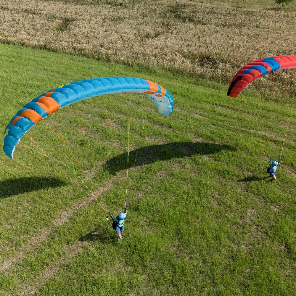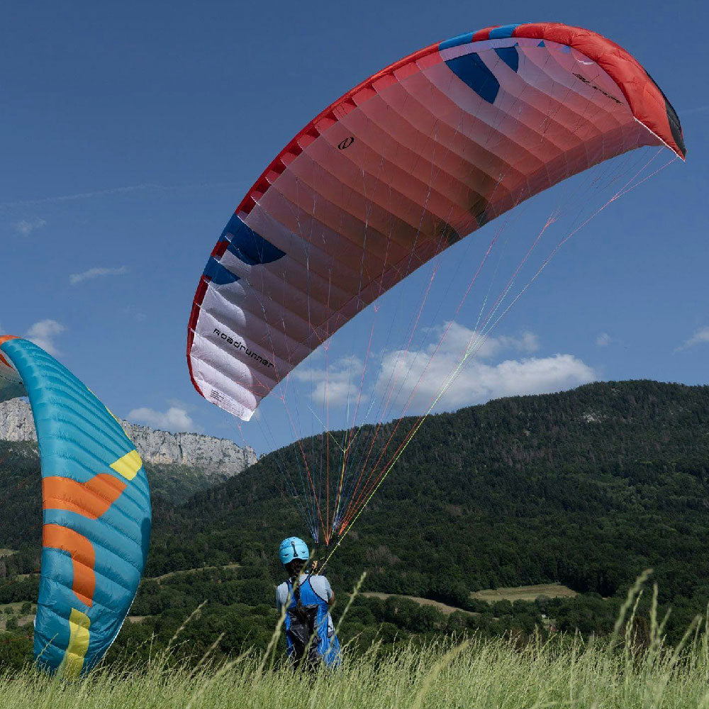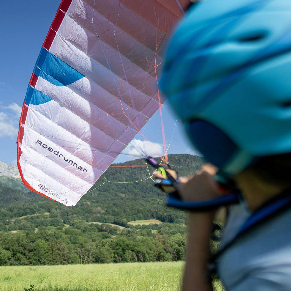 A reinforced leading edge makes inflation easy. The Roadrunner’s inflation characteristics are progressive and predictable. A two-riser system with split-A design allows training of various launch, control, and glider-disabling techniques. Magnet-attached brake handles are easy to grab, and re-place on the risers, while training.