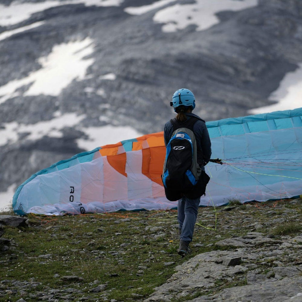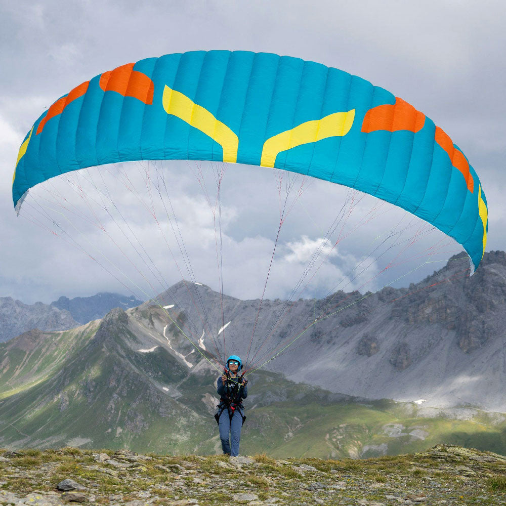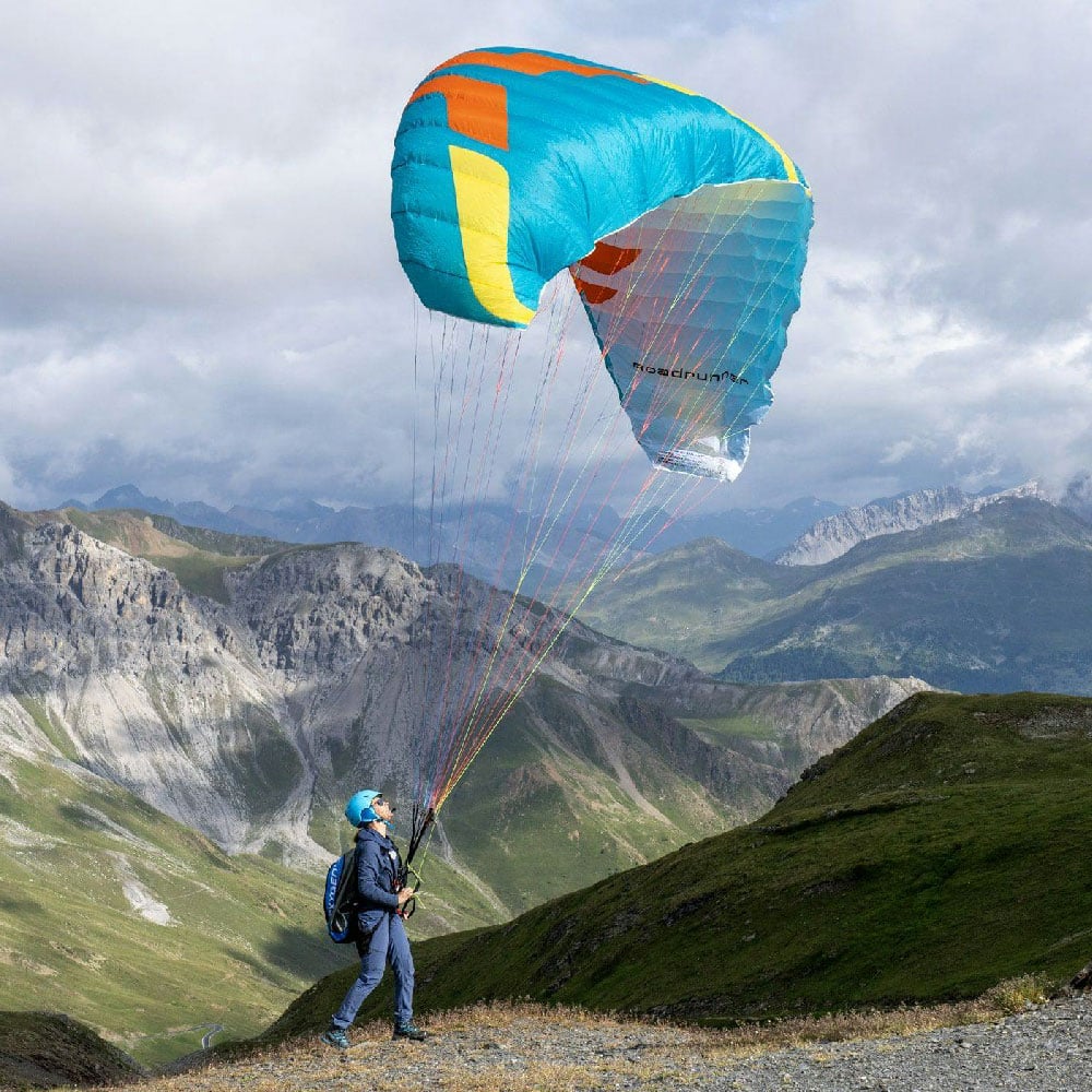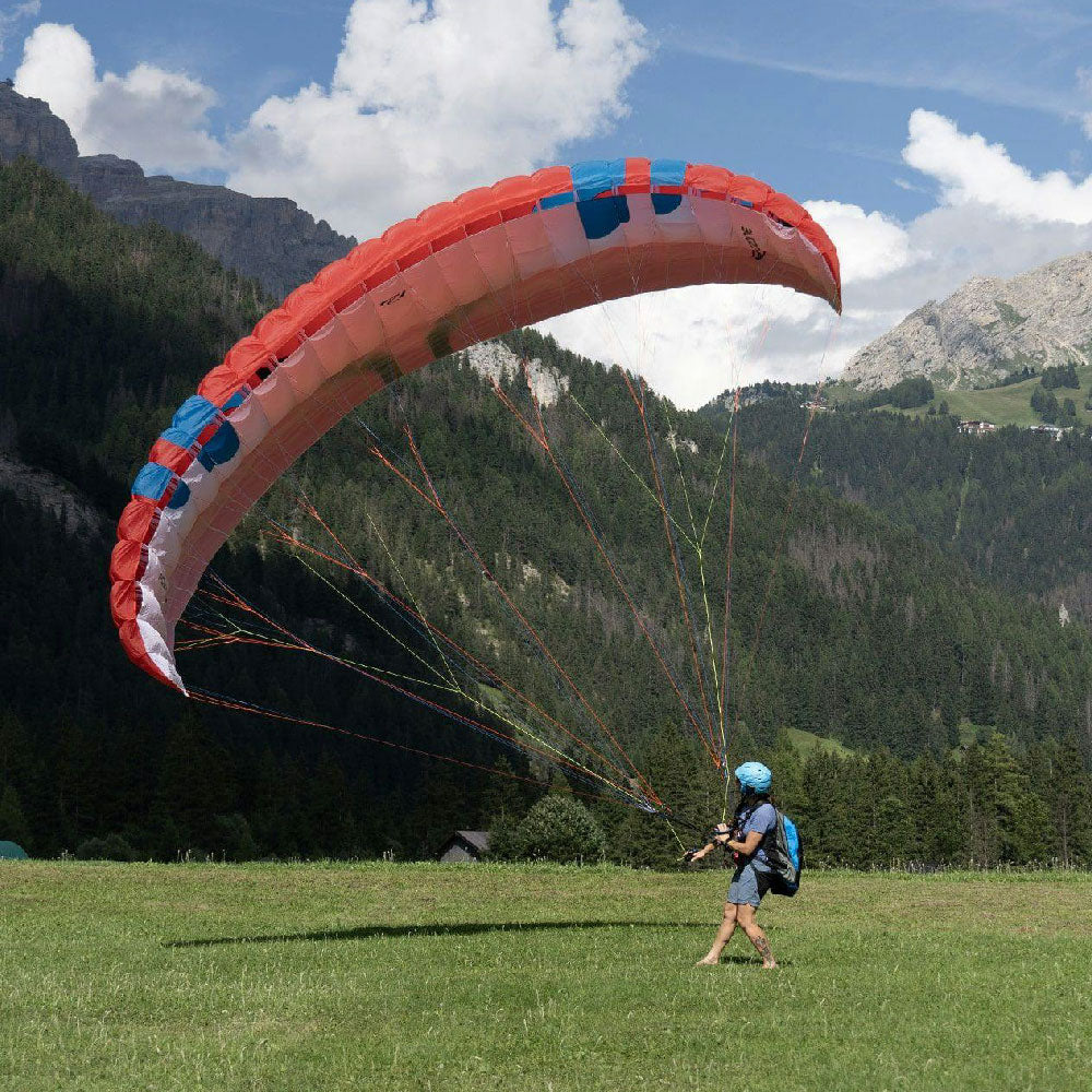 A reinforced leading edge makes inflation easy. The Roadrunner’s inflation characteristics are progressive and predictable. A two-riser system with split-A design allows training of various launch, control, and glider-disabling techniques. Magnet-attached brake handles are easy to grab, and re-place on the risers, while training.