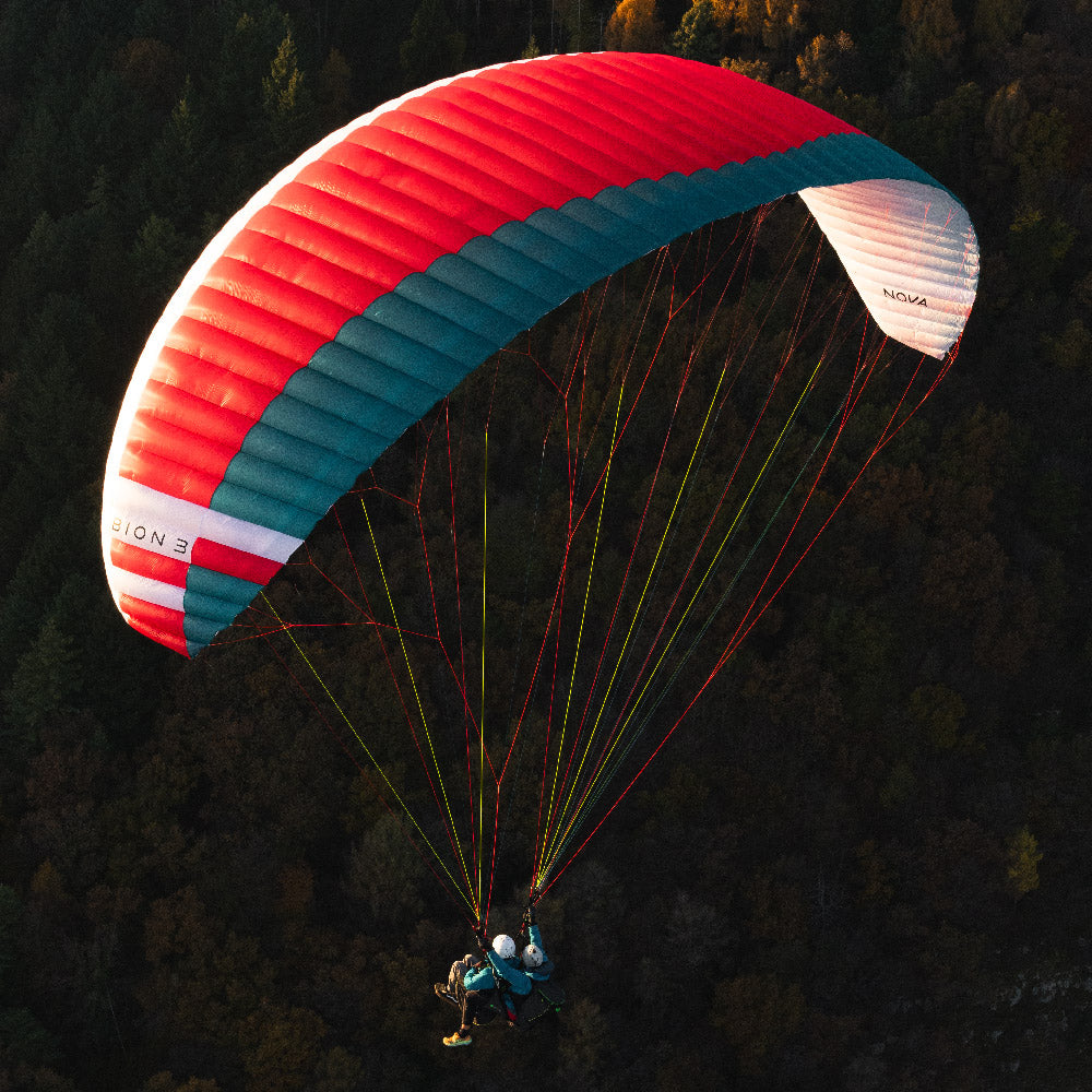 In my opinion, the BION 3 is a fantastic tandem glider for professional use. Takeoffs and landings are super easy, just like they should be with a tandem wing. And in the air, the brake pressure is light and comfortable, even when you're circling in thermals.