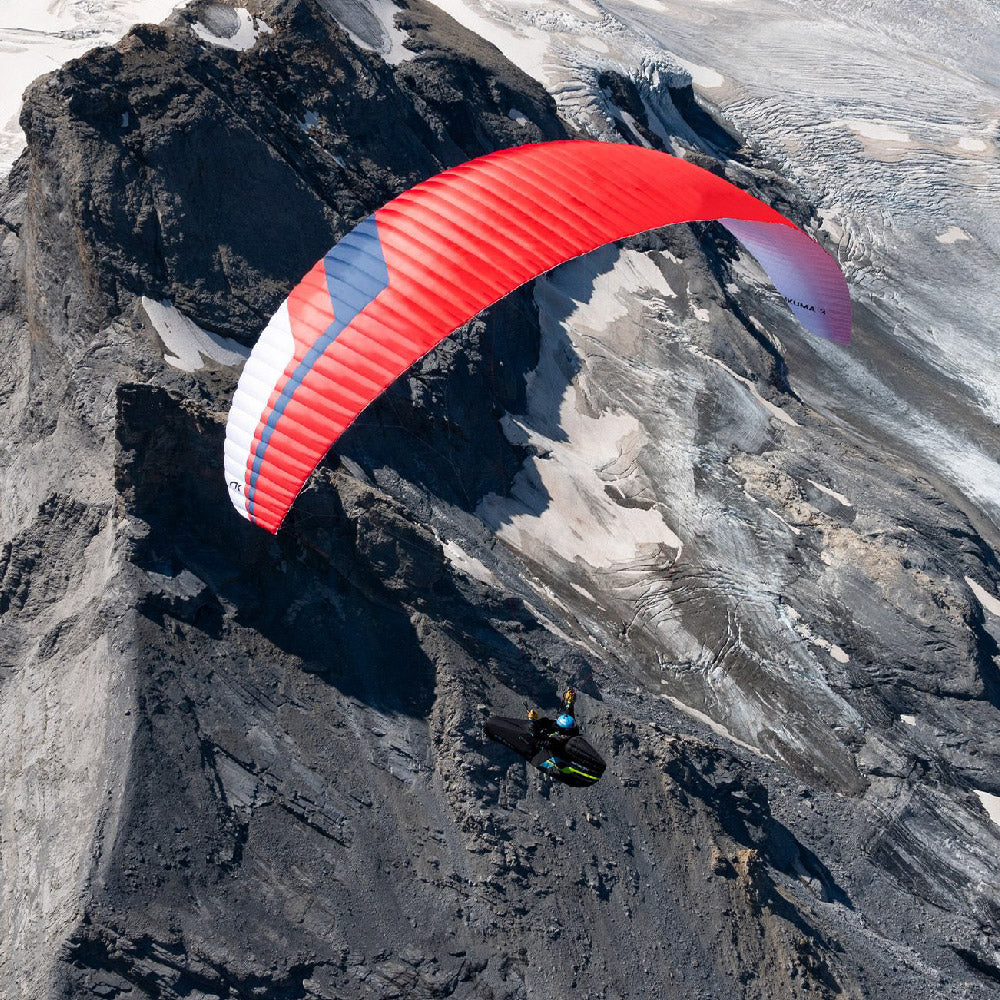"Launching the Ikuma 3 even in no wind conditions, rises smoothly and evenly. The Ikuma 3 rises effortlessly in more windy take-offs and stays above the pilot's head with a little brake. The Ikuma 3 even at 88 all up, can core thermals very narrow staying in the core very easily. The combination of the Arrow/Ikuma 3 while weightshifting and brake pulling is nothing but excellent! In a more strong thermals, and flying it at 93 all up, the handling is even better! and coring is even more satisfying! A piece of pure pleasure while thermal flying. The pitch is neutral and hands up all the way the Ikuma 3 enters the airmass slowly but efficiently. It clings to the thermal and climbs effortlessly. It feels like it guides you into the thermal. It doesn’t reject the rising airmass but seems to slide and cling to it slowly. All you need to do is let it fly, keeping the minimum of brake pressure. It floats nicely into the rising air mass.