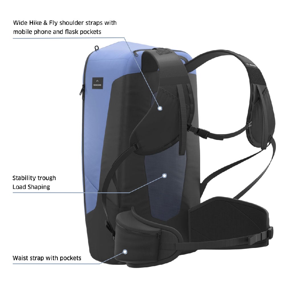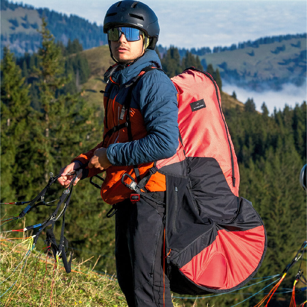 The fully redesigned backpack now provides enhanced carrying comfort with X-Alps tested features like functional shoulder straps and an improved hip belt. The contents, including the paraglider, create tension for stability and comfort on the back, meaning the backpack doesn't require a pre-shaped back panel. This approach makes the equipment lighter and more compact.