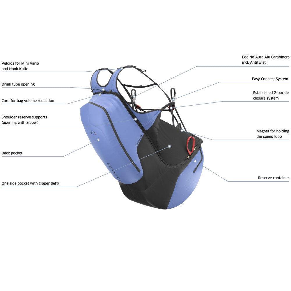 The airbag is now permanently attached to the harness, making the product simpler and easier to handle. Feedback showed that the EASINESS 3 version without an airbag and with a backside cover was rarely used. The reserve parachute container remains integrated into the airbag, and when using a